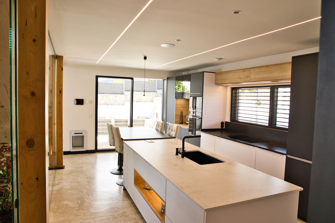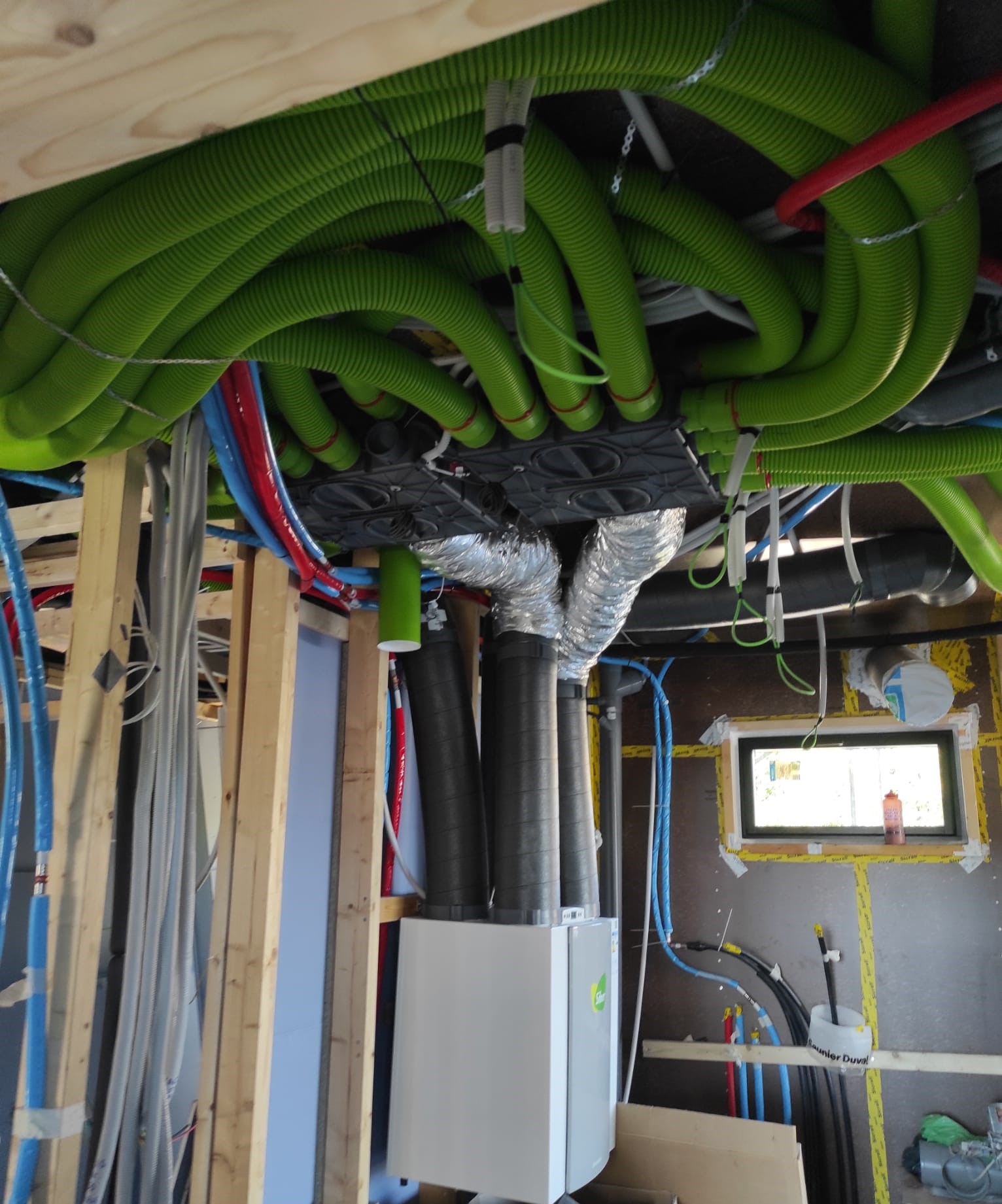 En ese sentido, Casa Sophia cuenta con dos sistemas distintos de ventilación con recuperación de calor de la marca Siber. Concretamente, una máquina de ventilación de sistema centralizado de 400 m³/h certificada Passivhaus y un sistema descentralizado. “Aparte de dichos equipos, cabe remarcar una novedad extraordinaria: la instalación del sistema de despresurización del terreno. Este permite la extracción del aire que se encuentra bajo la casa y lo expulsa por encima de la cubierta.