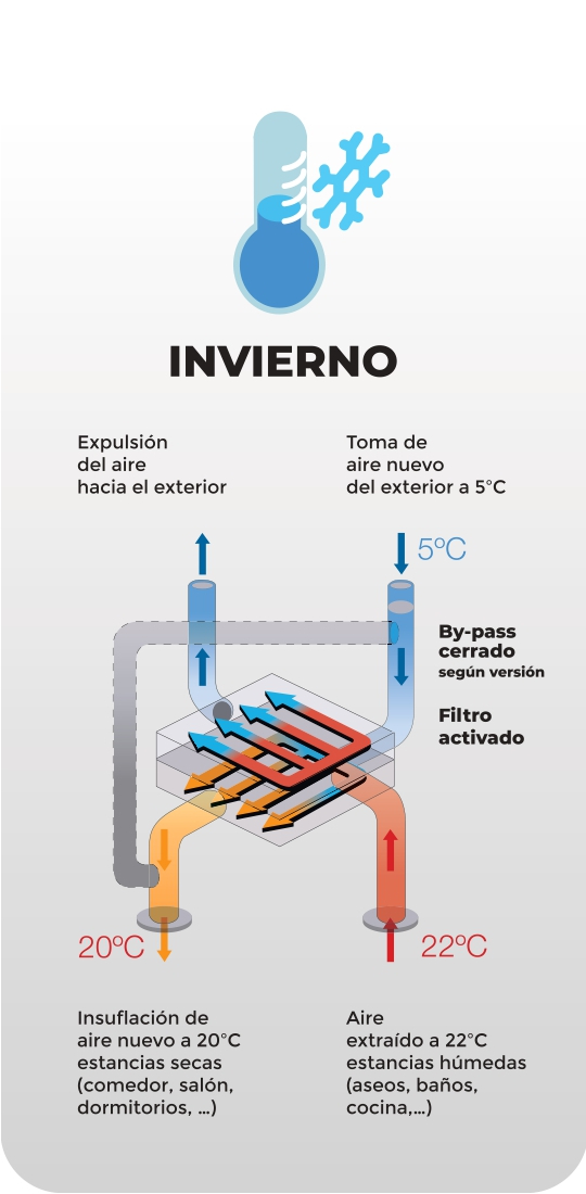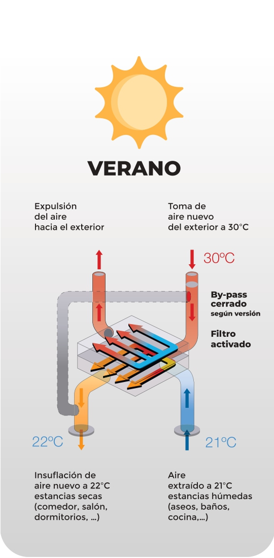 No caso de o ar exterior ter uma temperatura mais agradável do que a do interior, como pode acontecer nas noites de verão, o By-pass ativar-se-á automaticamente. Desta forma, estaremos renovando o ar da habitação de forma filtrada e saudável.