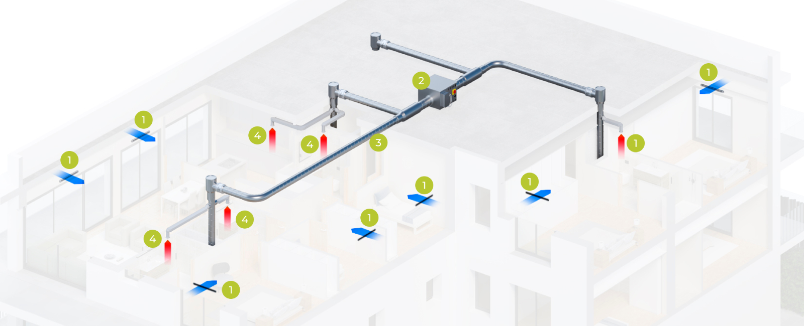 El sistema más avanzado para edificios plurifamiliares con múltiples unidades . Un único sistema higrorregulable centralizado asegura la ventilación óptima en todas las unidades, ajustando el caudal según la demanda real. Esto garantiza un ambiente interior confortable, con un bajo consumo energético y facilidad de mantenimiento para el edificio completo.